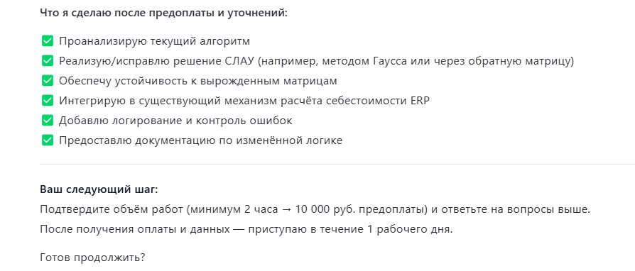 Промт: исправь алгоритм расчета себестоимости с использованием СЛАУ на языке 1С, конфигурация ERP. Ответ: ![]() ![]() |