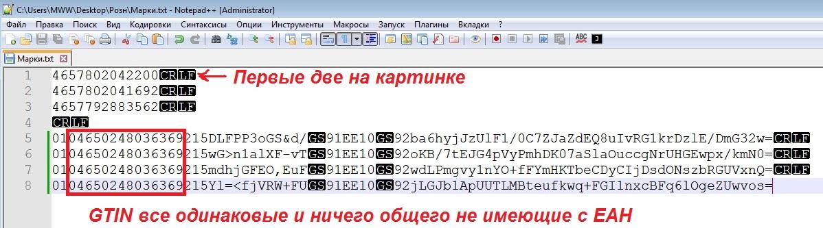 Я сразу, еще в (0) написал: "Подозреваю, что это косяк производителя товара"... Однозначно так и есть. А это: (0) Нет, я конечно вижу выход из положения - написать обработку, которой удалять из базы привязанные марки по этому GTIN, проданные ранее, перед продажей нового товара Сейчас поразбирался, так просто не сделать - марки пишутся в справочник ШтрихКодыУпаковокИТоваров, который испорльзуется в чеках... И еще попутно в регистр МаркиСУЗ... Это нужно все эти хвосты вычищать при удалении, что на самом деле не правильно. |