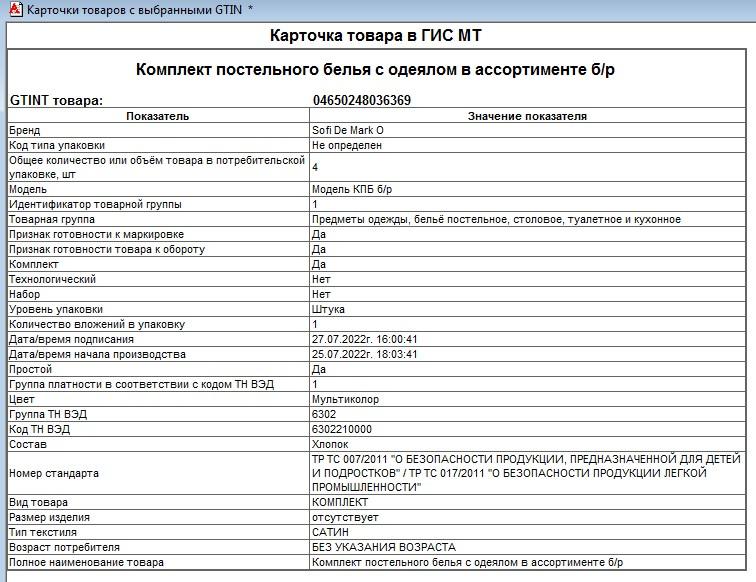 Что-вы! Ни боже-мой... Где я такое писал? Если уж создавать четыре разных карточки, то каждая со своим GTIN(EAN)... (15) Кто то занимался таким, это возможно? что то я сомневаюсь. Вот поверьте, возможно... Хоть это и полный бред. Я делал в своей УС, обработку для первоначального автоматического заполнения ТоварныхГрупп маркировки и признака "подакциз"... Там в цикле бегу по всем своим товарам из базы, и по всем ШК ЕАН(кроме внутренних) запрашиваю карточки по GTIN, и из них беру необходимую мне инфу и записываю в базу... Я был первый раз в шоке - запрашиваю 1000 GTINов, а прилетает 1500 карточек! Как? Откуда? Стал разбираться, а там на некоторые GTIN по 4-5 карточек! Видимо, заведенных разными производителями в разное время... ИМХО - это совсем не правильно - объект то один по сути... Но, это проблема ЧЗ.(или не проблема, им на это пофиг)... В моем случае, скорее всего, эти тряпки примерно одинаковые, и производитель поленился или пожадничал(я так понимаю, регистрация ЕАН как GTIN в "Национальном каталоге" тоже не бесплатна?), поэтому все свои поделки свалил в одну карточку ЧЗ с одним GTIN... А у себя в базе учитывает как 4 разных товара, каждый со своим наименованием, ЕАН(не внесенным в НК как GTIN) и возможно ценой. Я в этом товаре не разбираюсь, на сколько отличается одна простыня/пододеяльник от другой? Х.з... Если там отличия минимальны, ну, там на одном "цветочки синенькие, на втором зелененькие"(это как "жвачки" с разными вкусами одного бренда, веса и вида), то может и не стоит делить товар по разным карточкам. Но, если это принципиально разные модели (ну, например один из хлопка, а второй из шелка, или один двуспальный, а второй полуторка, и объединяет их только бренд), которые будут продаваться в розницу как отдельные товары с разными розничными ценами - то такого быть по возможности не должно... Ну да ладно - в (13) я описал пусть "костыльное", но решение проблемы. Работает, и ладно. Устаканится со временем. |